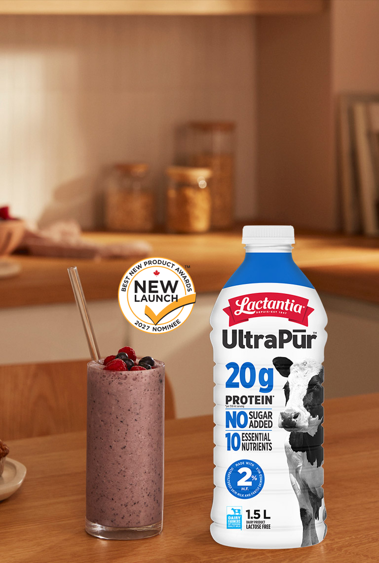 Lactantia® UltraPūr ultrafiltered milk offers more protein while reducing sugars.